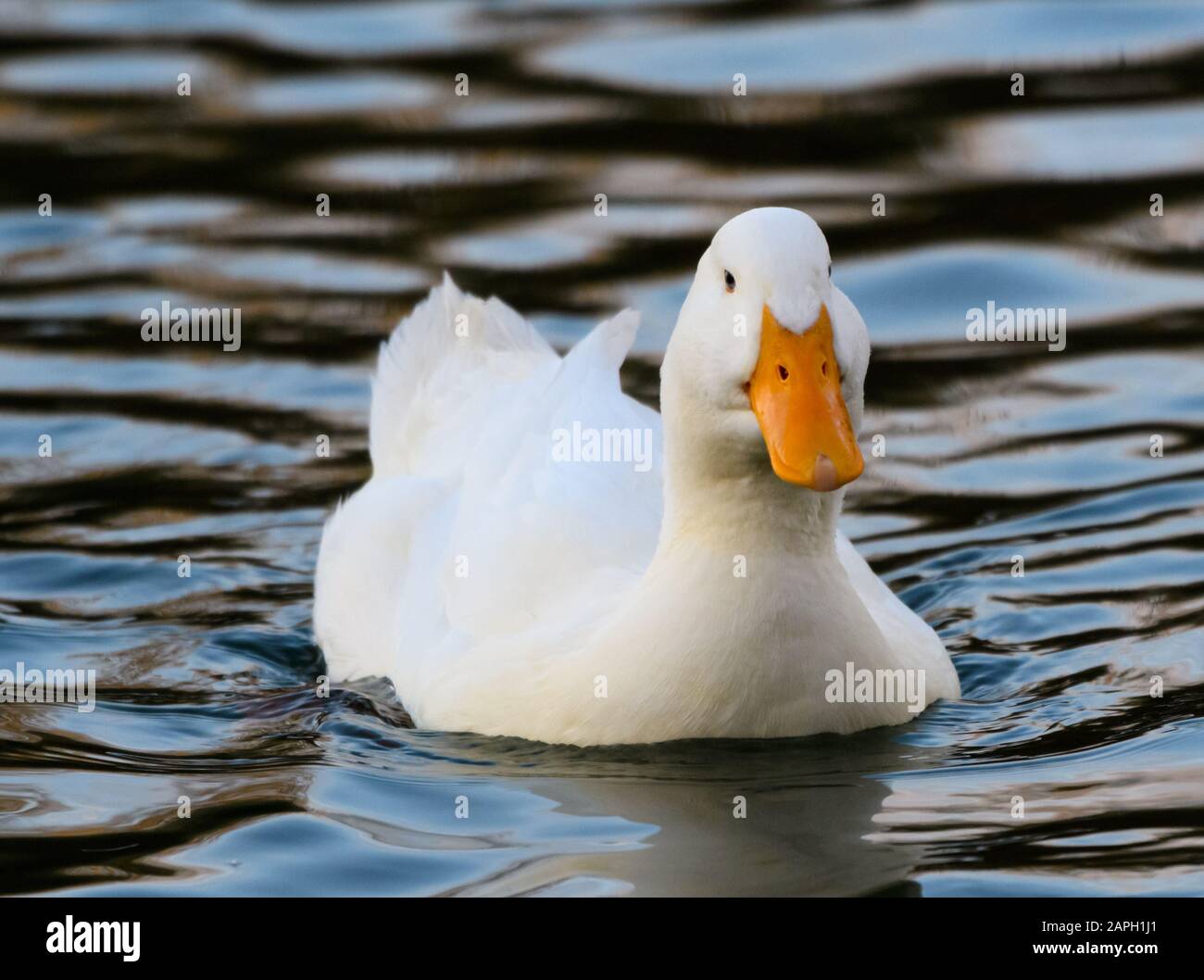 A Pekin Or Long Island Duck A Domesticated Variant Of The Mallard Swimmining On The Waters Of Dinton Pastures Stock Photo Alamy